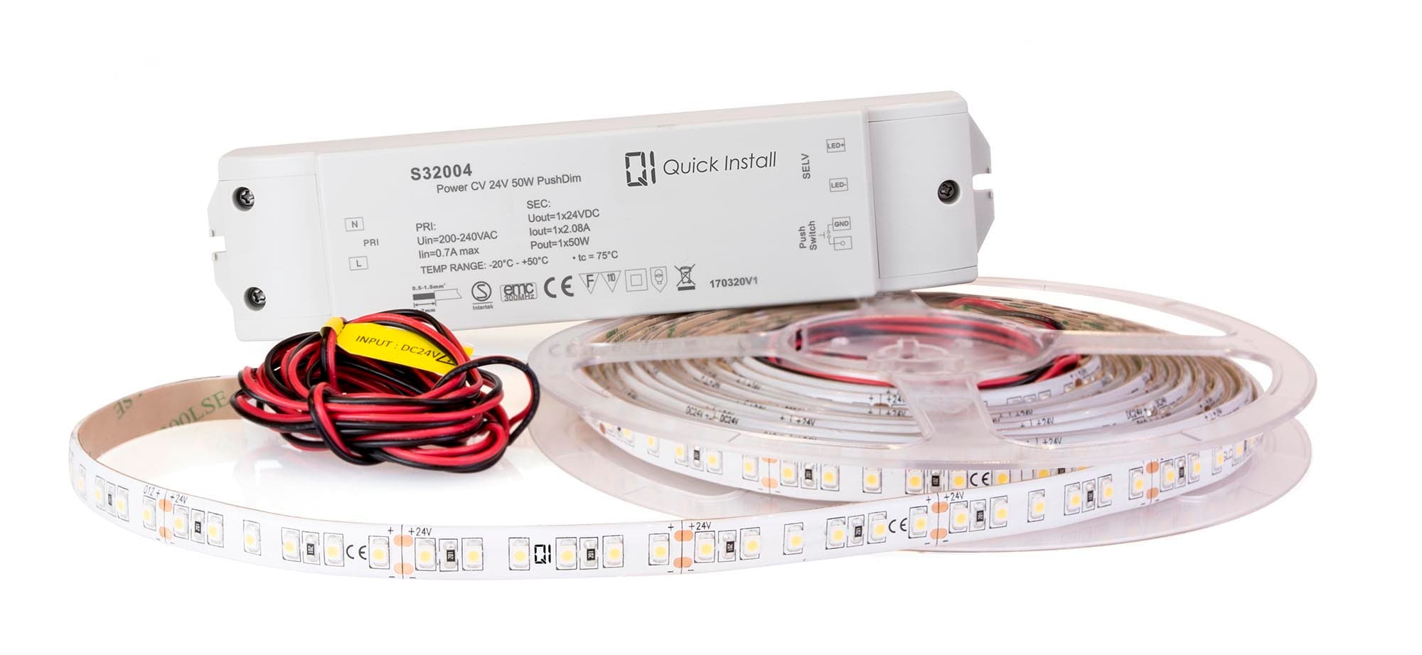 QUICK INSTALL - Qi LED-strips Pro-sett 5m, Push dim driver. Leveres med Strips i IP54. 2700K, 875lm/m. - 3787002