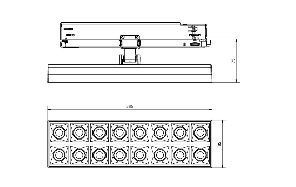 Driveren er integrert i skinneadapteret og har dip switcher, slik at man kan stille inn lyset til maks lysstyrke (standard) eller UGR <19.