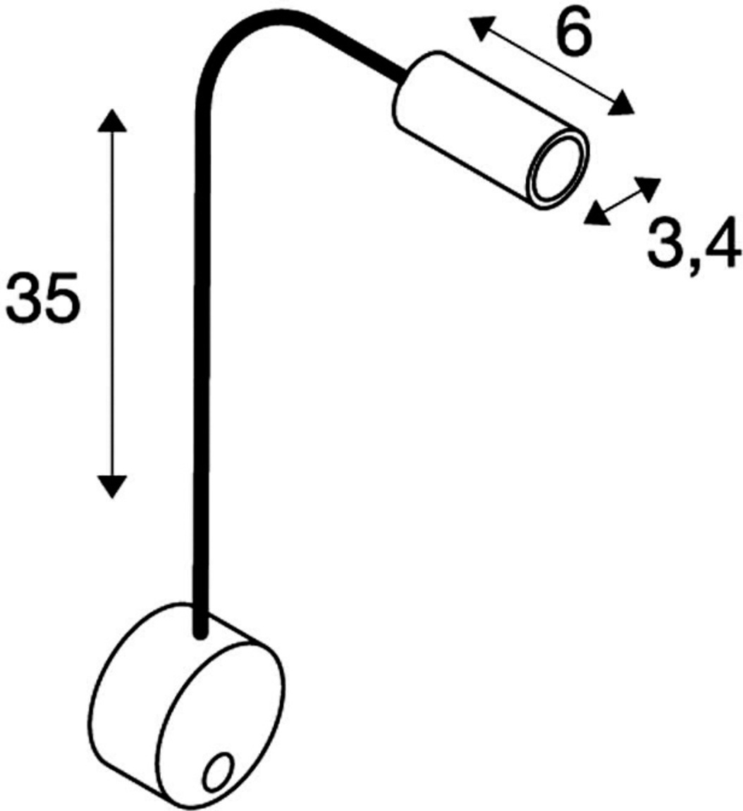 230V-displayarmatur for veggmontering fra DIO FLEX PLA-TE-serien, der rosett og hode er forbundet via en fleksibel arm. Armaturets bryter gjør at den kan tilpasses individuelt og er fleksibel i bruk. Armaturet kobles direkte til strømnet-tet (230 V). Alternativt finnes armaturet med utbyttbar LED-lyskilde med GU10-sokkel.