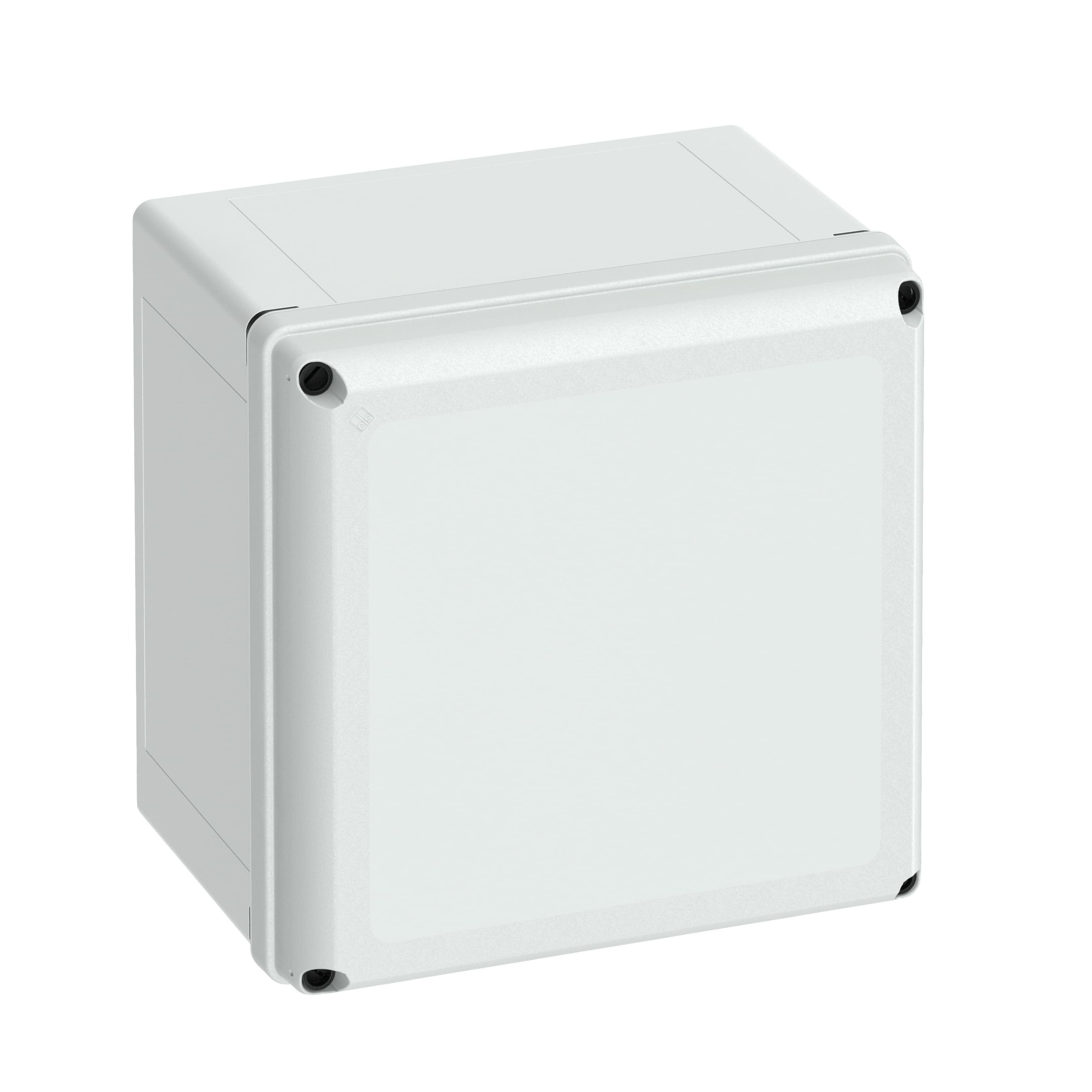 Tom kapsling, egnet for installasjon i røffe omgivelser og på områder utendørs uten beskyttelse, Boks: glassfiberforsterket polykarbonat, hvit, tilsvarende RAL 7035, Lokk: Polykarbonat, med grått lokk