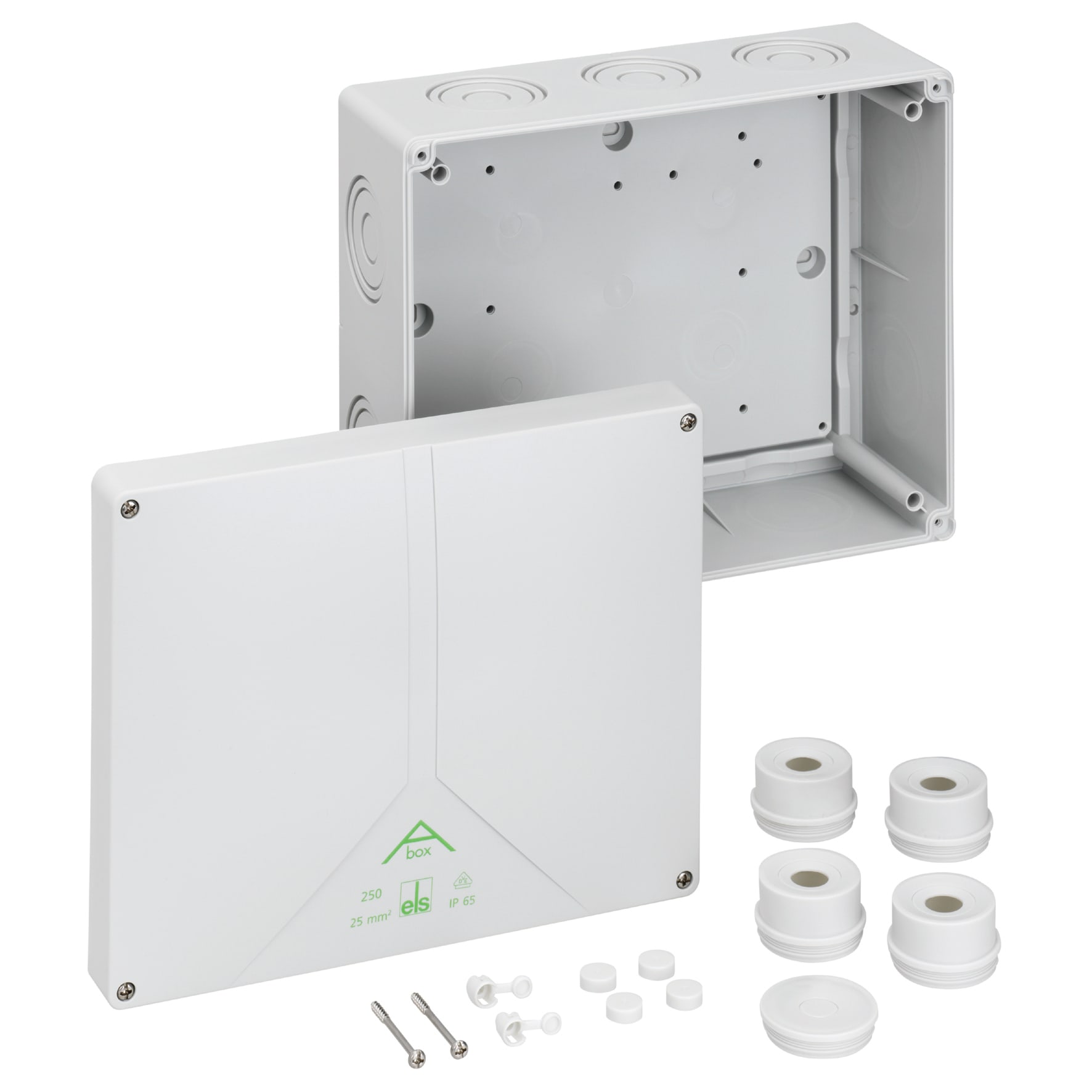 Robust kvalitetsboks til utendørsinstallasjoner produsert i halogenfri polystyren. Brannsikker og selvslukkende. Testet og godkjent i henhold til UL94-HB2. Abox 025 og 040 er utstyrt med membrangjennomføringer på alle sidene og i bunnen, noe som gjør installeringen rask og enkel. Det er enkelt å skjære bort membranen for å montere et metrisk skruefeste i stedet. Andre modeller med metriske utstøtninger på alle sider og i bunnen, nippel følger med. Kraftig integrert teflontetning garanterer en høy grad av beskyttelse, doble rustfrie skruer som ikke kan løsne, i lokket. Abox finnes i en tom versjon og komplett med 5-polet skruklemme, det er mulig å montere klemmen i forskjellige stillinger for ekstra stor koblingsplass. Abox 060-350 har en høy, sidemontert koblingsklemme som gir enklere tilkobling og større plass ved gjennomføring av kabelen.