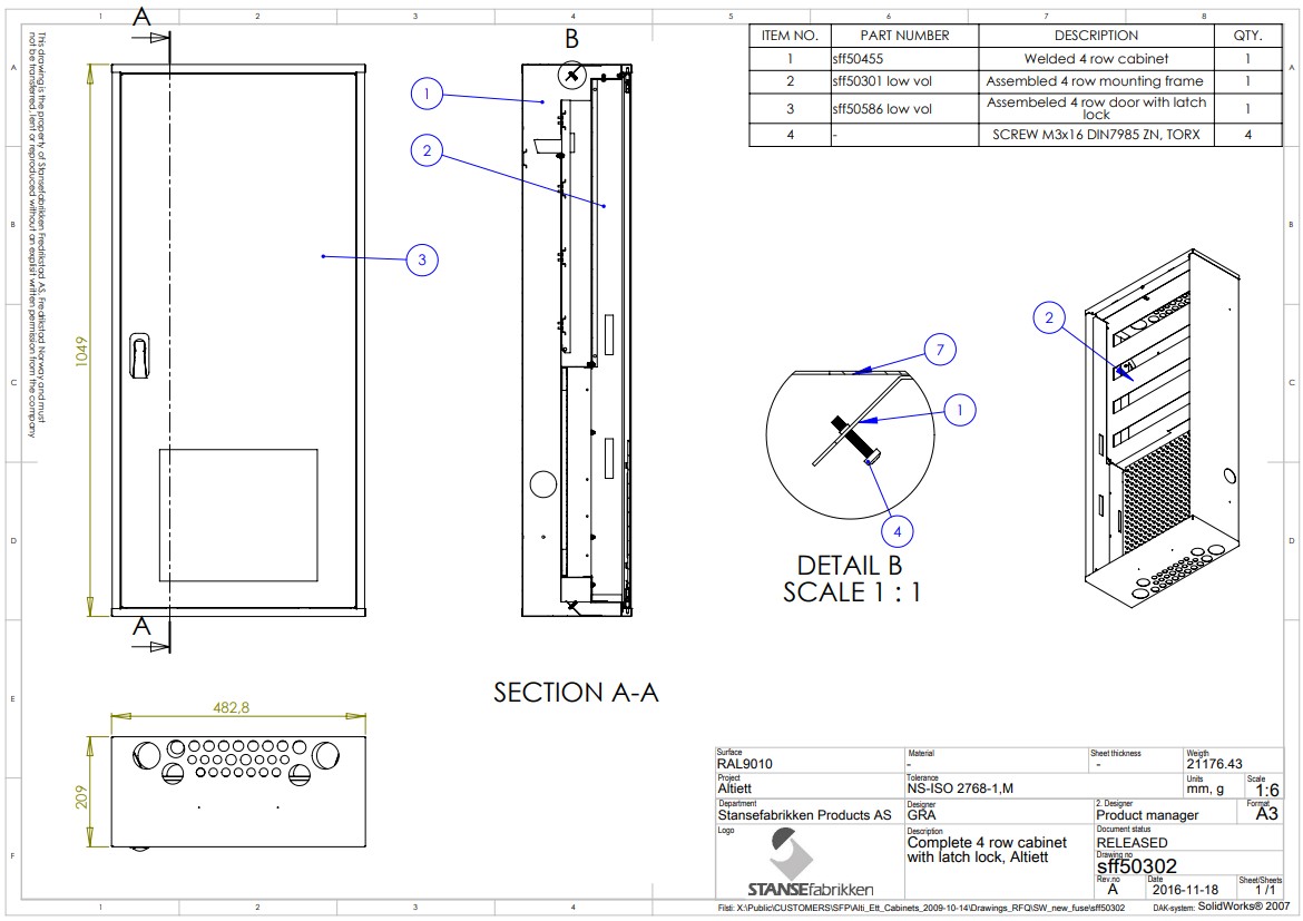 Skapet kjennetegnes av smarte og effektive løsninger som sparer montasjetid og gir økt sikkerhet. Sikringsskinnene kan vippes frem for enkel og sikker kabeltilkobling.