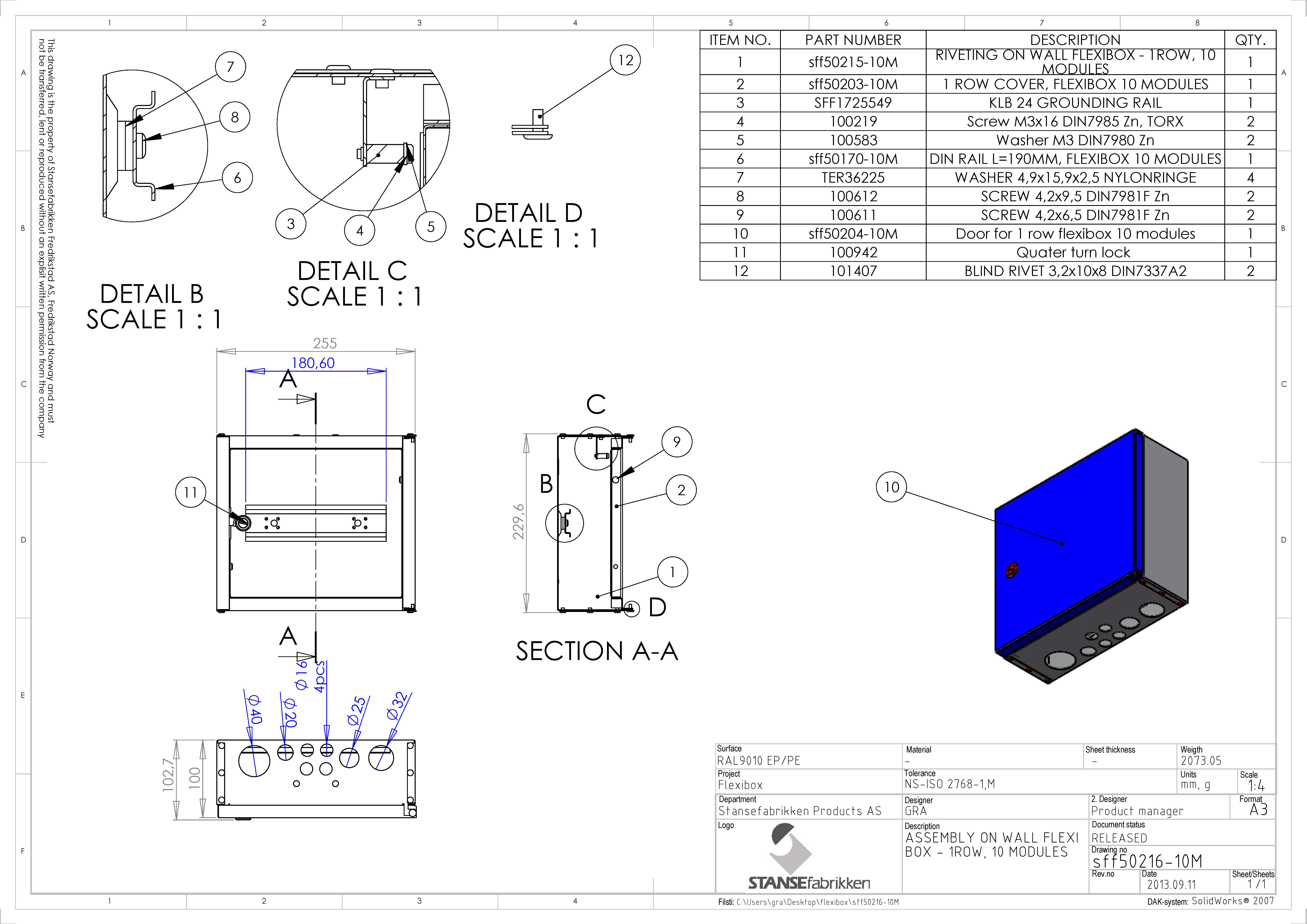Flexibox for påvegg Montering. Nemko godkjent i.h.t. Tavlenormen EN60439 for 2x40A IT/230V/50Hz, 3x40A IT/230V/50Hz og 4x40A TN/400V/50Hz. Skapet har 1 sikringsskinne for 10 moduler. Dørlås har meiselspor og vrider, men kan enkelt byttes til nøkkellås.