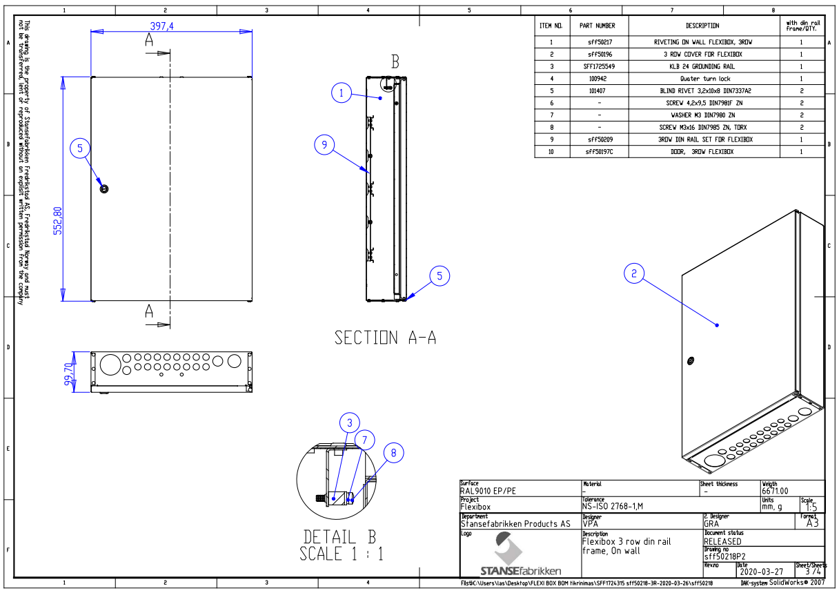 Automatsikringsskap for påvegg montering. Nemko godkjent i.h.t Tavlenormen EN60439 for 2x63A IT/230V/50Hz, 3x40A IT/230V/50Hz og 4x40A TN/400V/50Hz. Skapet har 3 sikringsskinne fhver med 18 moduler. Frontrammen med dør har regulerbar innfesting for veggplatetykkelse fra 12 til 26 m m. Dørlås har meiselspor og vrider, men kan enkelt byttes til nøkkellås.
