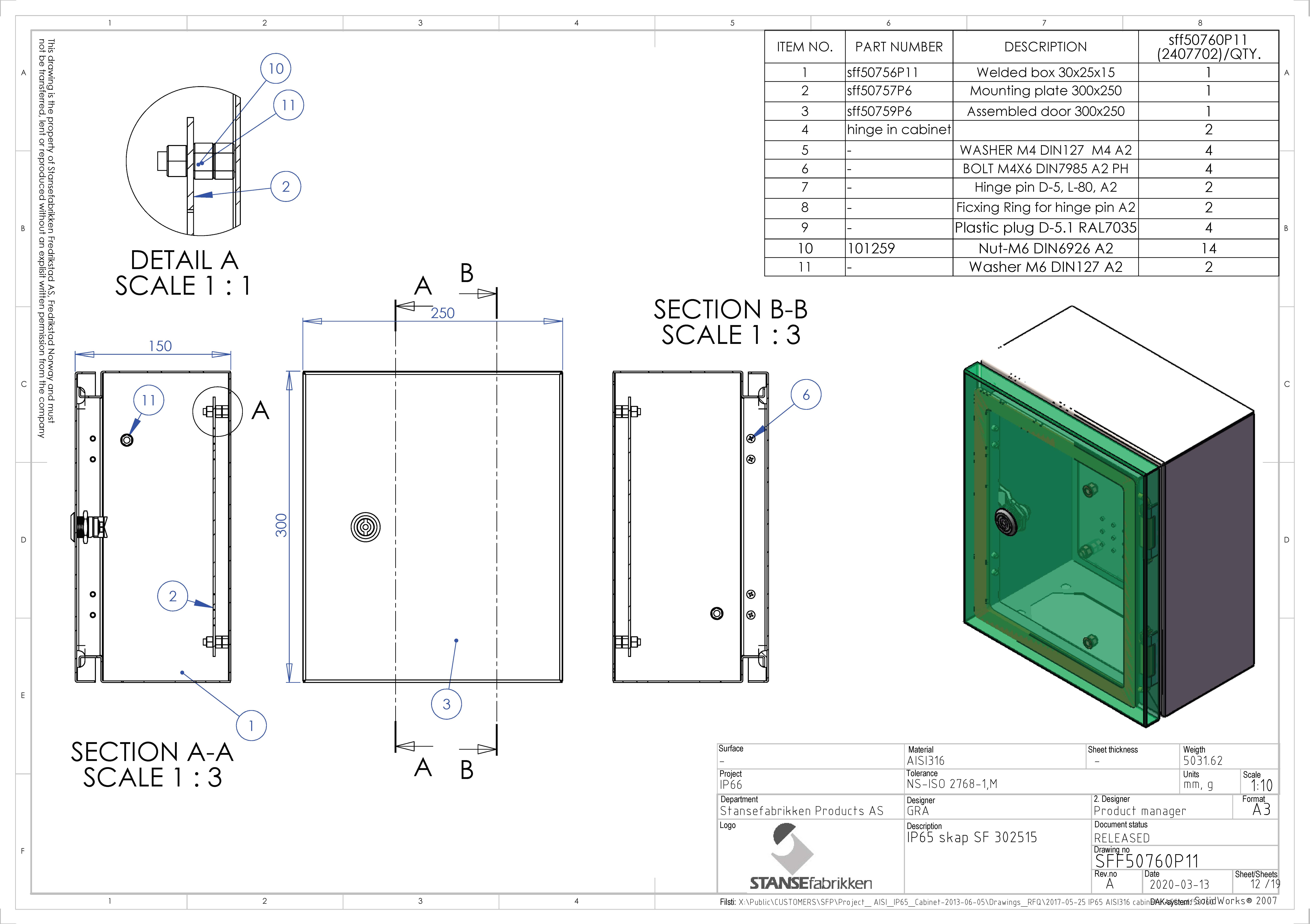 Skapet er produsert i 2 mm mattpolert syrefast 316, EN 1.4404 (SIS 2343)