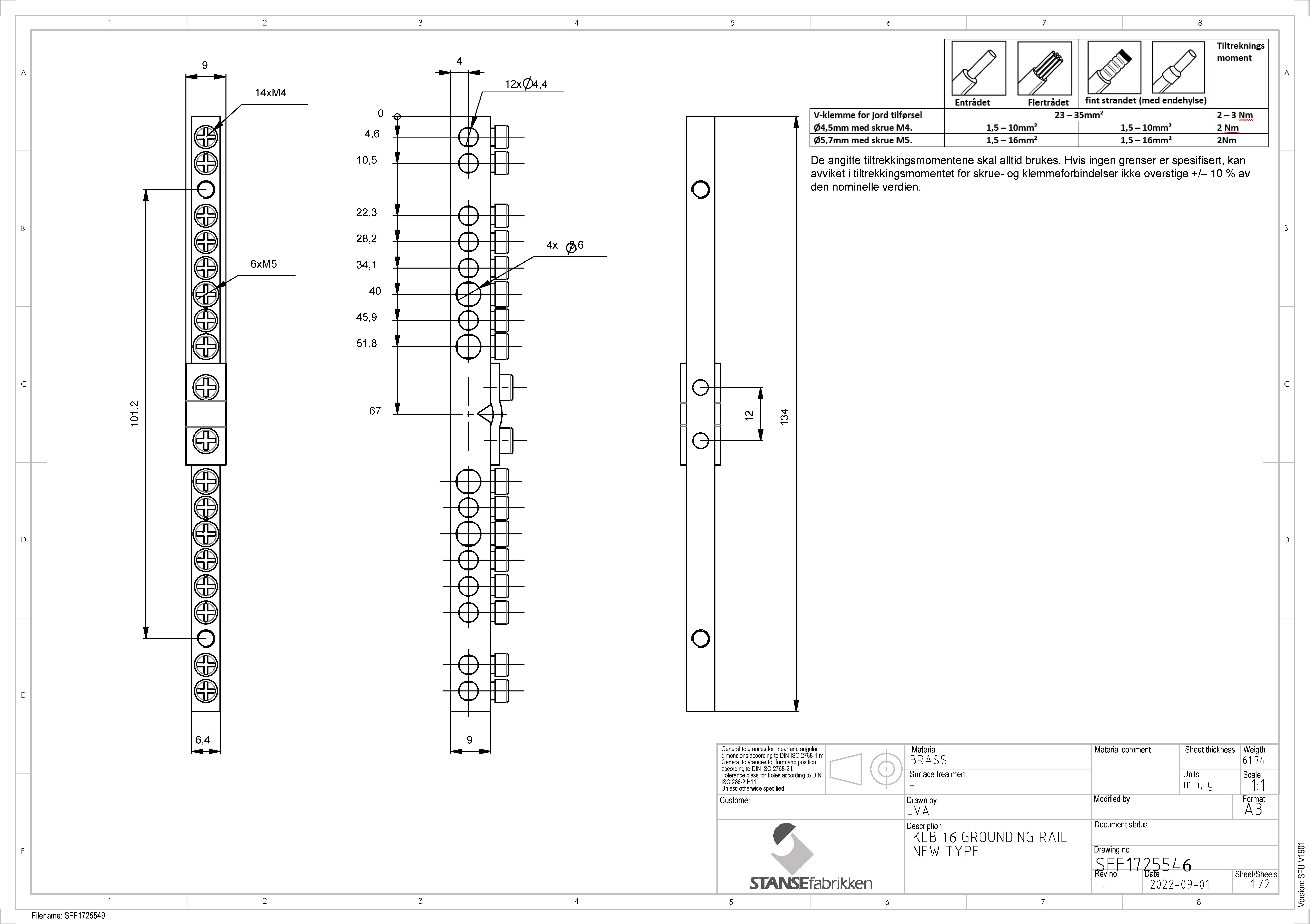 Ø5,5mm 4stk. med skrue M5. Max: 16mm² enkjernet leder eller 10mm² med endehylse og tilkoblings moment 2Nm