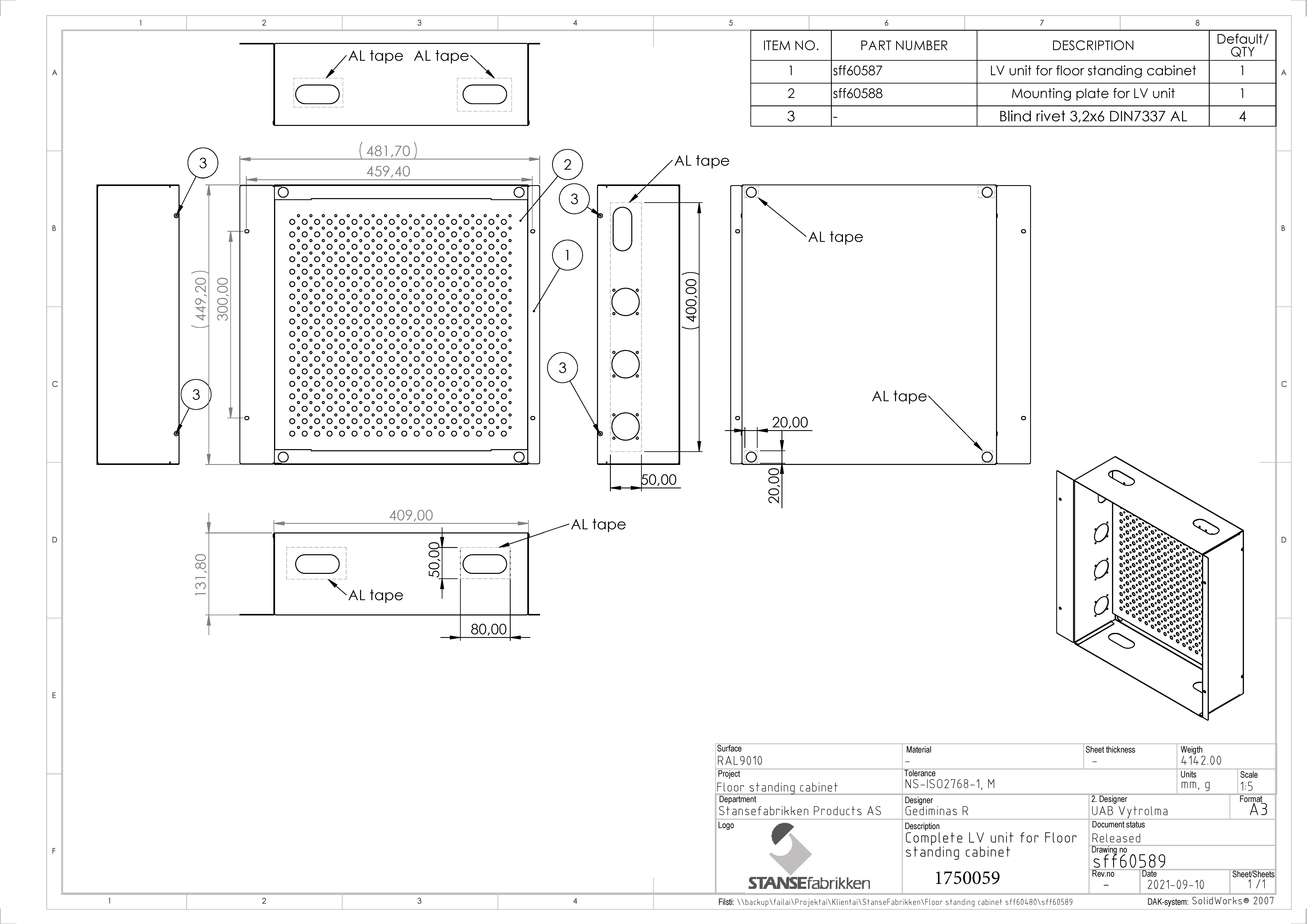 Svakstrømsfelt som kan monteres inn og erstatte 3 modulrader i skapet. Utsparringer til 3 stykk Schuko kontakter. Samt kabelinnføringer og montasjebrett. Alle utsparringer er dekket med lakkert aluminiumstape.