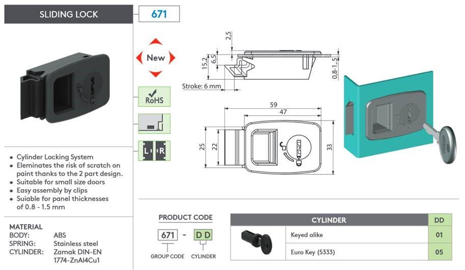 Skyvelås m/sylinderlås og nøkkel. Til nyere Flexibox OU og AltiEtt 130, med innfelt og avtagbare dører.