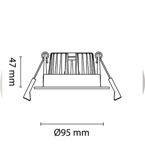 Ytre diameter Ø95mm, hullmål Ø82-84mm, høyde 51mm fra underkant himling. Klasse II, IP44
